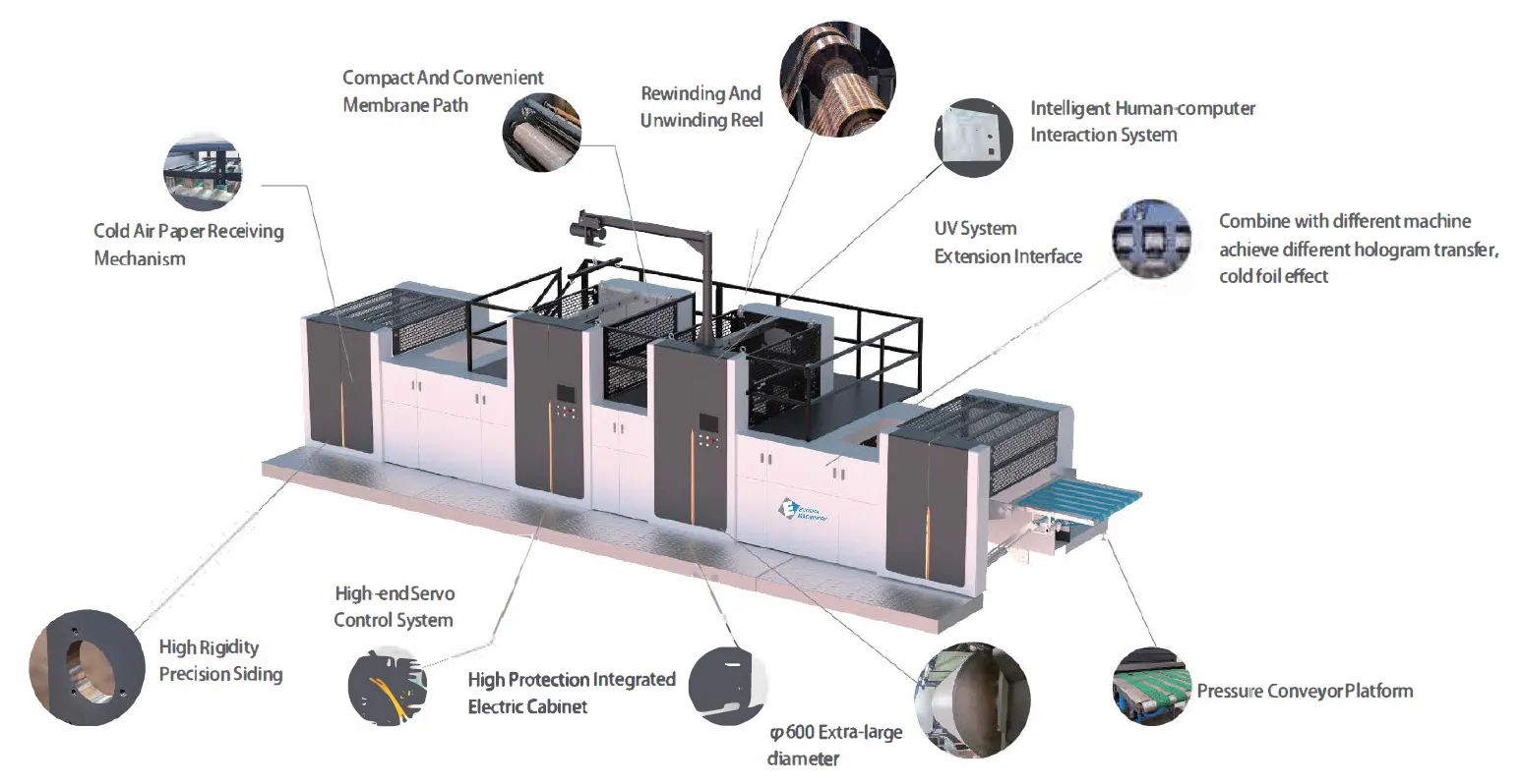 واحدهای تکمیلی با قابلیت اتصال به ماشین چاپ اسکرین تمام اتوماتیک، دستگاه ورنی زنی یووی موضعی، ماشین چاپ افست، ماشین چاپ گراور تک رنگ و غیره را دارد. با هدف دستیابی به جلوه انتقالی هولوگرام ، انواع مختلف جلوه فویل سرد . این ماشین به طور گسترده در سطوح چاپ ضد جعل با کیفیت بالا مانند سیگار، شربت، دارو، لوازم آرایشی، مواد غذایی، محصولات دیجیتال، اسباب‌بازی‌ها، کتاب‌ها و غیره، انواع مختلف ورق کاغذ، بسته‌بندی ورق پلاستیکی استفاده می‌شود.