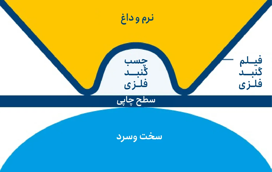 در “گنبد فلزی”، یک چسب واکنش‌پذیر حرارتی با استفاده از چاپ اسکرین، به عنوان مثال، با Gallus Screeny DY، اعمال می‌شود و سپس با اشعه UV خشک می‌شود. سپس تصویر چاپ شده با یک فیلم فلزی واکنش‌پذیر حرارتی لمینت می‌شود. فیلم با یک سیلندر لمینت نرم و گرم شده روی چسب فشرده می‌شود. این فیلم پیرامون چسب اعمال شده می‌نشیند و همزمان با چسب اعمال شده توسط سیلندر لمینت داغ می‌شود. چسب در طول این “فرآیند لمینت” دوباره فعال می‌شود و فویل فعال می‌شود. فعال‌سازی حرارتی باعث می‌شود فویل به چسب بچسبد. سپس تصویر چاپ شده خنک می‌شود و یک اثر برجسته فلزی – “اثر گنبد فلزی – Metallic doming effect” – را نشان می‌دهد.
