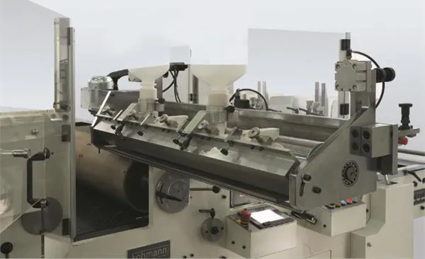 بخش چسبزنی را میتوان به راحتی برای تنظیم و تمیز کردن بیرون کشید. صفحه جداکننده چسب برای کنترل مقدار و مساحت چسب قابل تنظیم است. در صورت توقف دستگاه، سیلندر نورد چسبزنی را بلند میکند و سپس توسط موتور دیگری به حرکت در میآید تا از نشت چسب جلوگیری شود. گزینه میز آمادهسازی از قبل نیز موجود است. اپراتور میتواند قالب را در خارج از دستگاه قرار دهد.