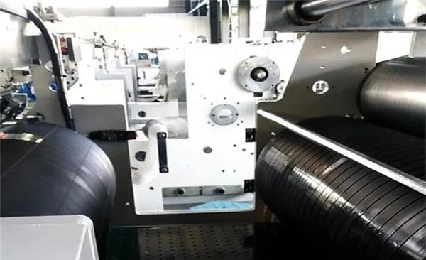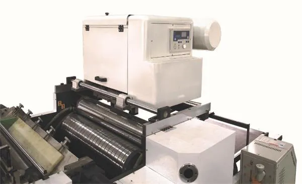 بخش خط تازنی مجهز به چرخهای گرمایشی مستقل برای خطزنی است. یک سیلندر مستقل وجود دارد که با روغن گرم میشود تا فیلم پلاستیکی تابدار را صاف کند. مجهز به سیستم برش گوشهای است که توسط سروو کنترل میشود تا فیلم پلاستیکی صاف شود. مجهز به سیستم ریز تنظیمات.