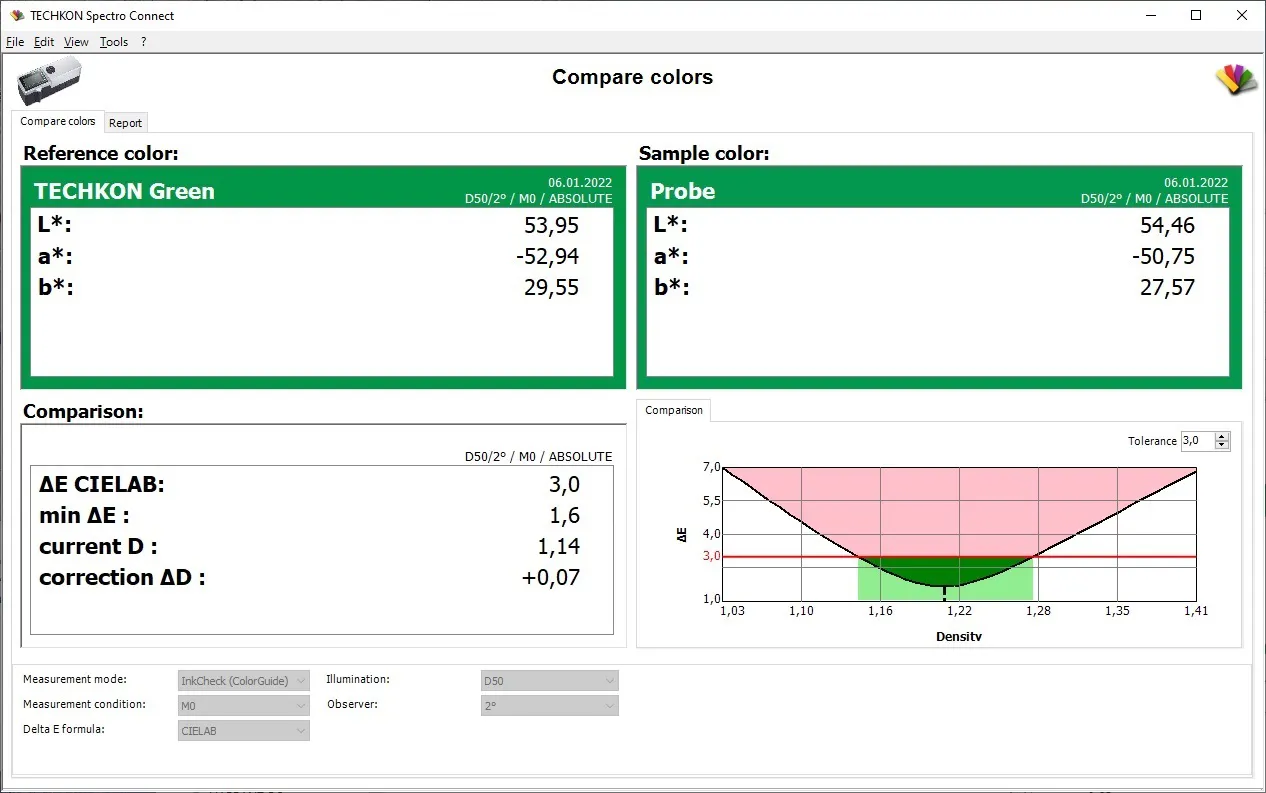 نرمافزار ویندوز TECHKON SpectroConnect که در بستهبندی محصول موجود است، ارتباط بین دستگاه اندازهگیری و کامپیوتر را از طریق اتصال USB یا از طریق اتصال WLAN (اختیاری با SpectroDens) برقرار میکند. پردازش دادههای مقادیر اندازهگیری شده در کامپیوتر بسیار راحت است و دادهها را میتوان مستقیماً به Microsoft Excel™ یا هر برنامه دیگری که قابلیت ویرایش دارد، منتقل کرد.